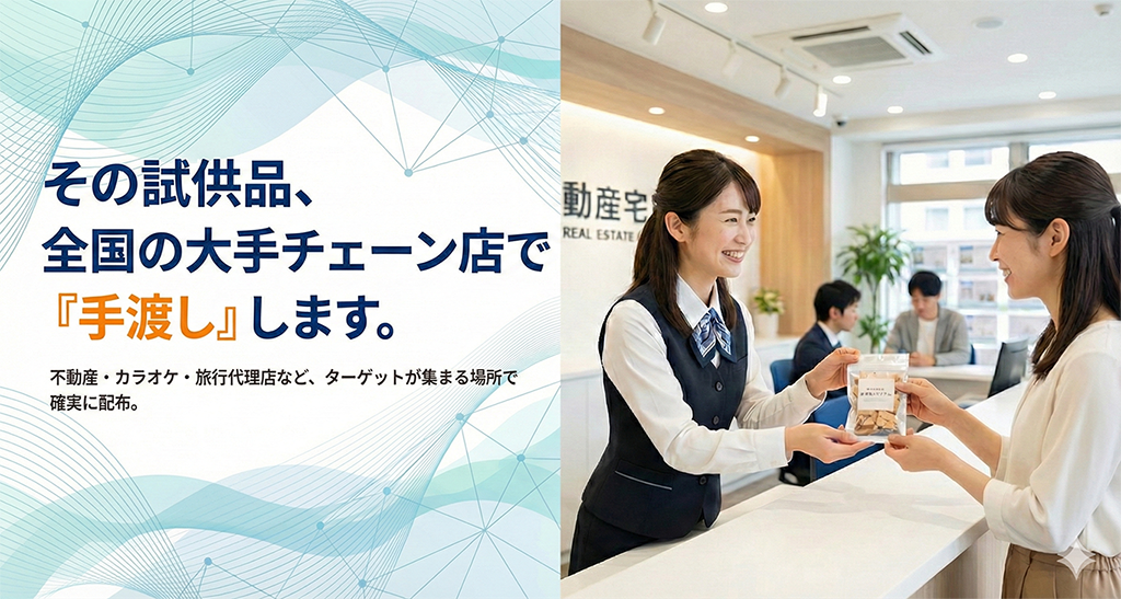手配した各ルートの施設スタッフから、ターゲットとなるエンドユーザーへ直接サンプルを手渡しで配布します。「お会計時」や「サービス提供後」など、最も受け取ってもらいやすく、好印象を与えられるタイミングで配布されるよう、施設側と連携して実施します。